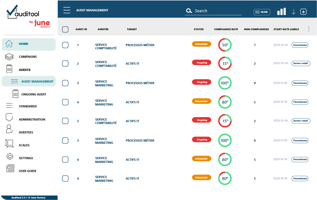 Auditool by June Factory aide les entreprises à gérer leurs conformités (réglementaires, normatives et internes) grâce à une plateforme unique d'orchestration du contrôle continu et des audits périodiques.