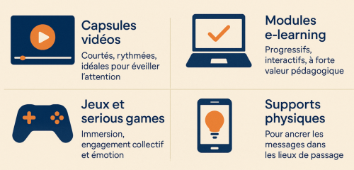 Et si le format valait autant que le fond ? Vidéo, module e-learning, jeu, affiches, mobile… Choisir le bon vecteur de diffusion, c’est déjà poser la première brique de l’adhésion.