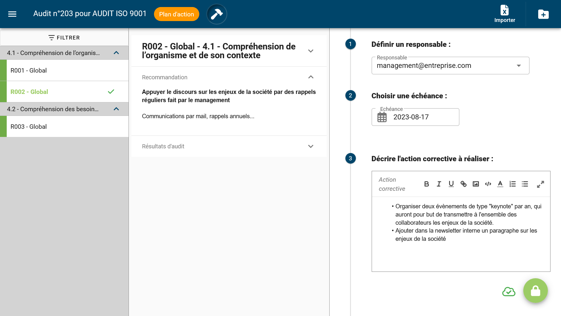 Pilotez le cycle de vie de tous vos audits, centralisez vos travaux, rapports, plans d'action et revues dans un logiciel sécurisé.