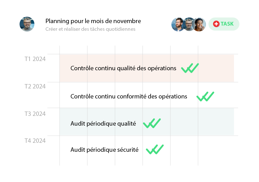 Planifiez votre plan annuel d'audit de conformité. Croisez vos référentiels internes, normatifs et réglementaires pour synthétiser vos points de contrôles. Auditez et relevez les non-conformités qui feront l'objet d'actions correctives.