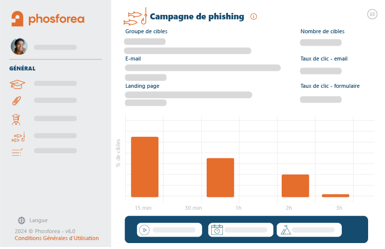 Suivez en temps réel le taux d'ouverture de vos emails, le taux de clics sur les liens piégés, la soumission de formulaire sur les pages d'atterrissage. Analysez les tendances par groupe de cible, par campagne afin de communiquer les résultats avec la direction et de prévoir vos prochaines actions de sensibilisation.